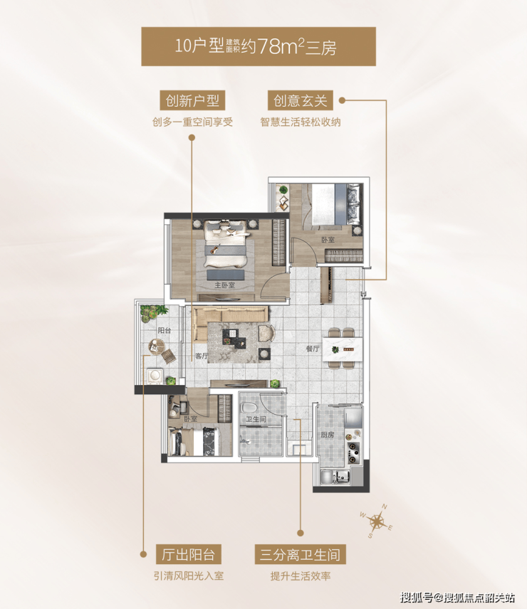本次上新建面约79㎡三房,灵巧户型,创享多一重空间惊喜,一家三口的幸福装载其中。创意玄关,收纳智慧生活空间,动静分区,让幸福各得其所。阳光主卧,一线临河视野开阔,畅享丰富人居生活。