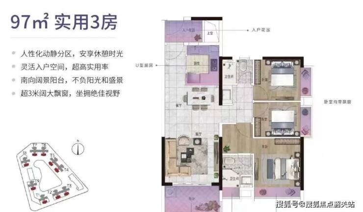 建面约97㎡户型户型设计的空间利用程度高、动静分区做的也好,而且全户型朝阳,还可选东南或西南。