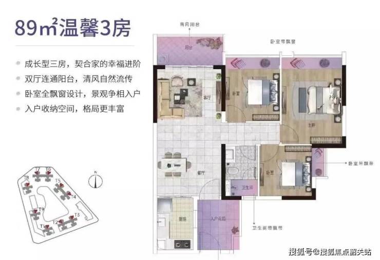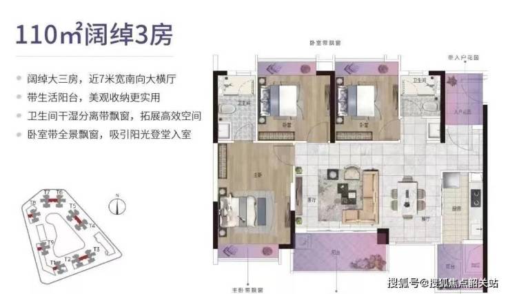 建面约110㎡的阔绰3房,纯南北对流户型,且设计约7米宽的南向大横厅,似将要把整个阳光揽入屋中。增加了一个生活阳台,美观收纳更实用。