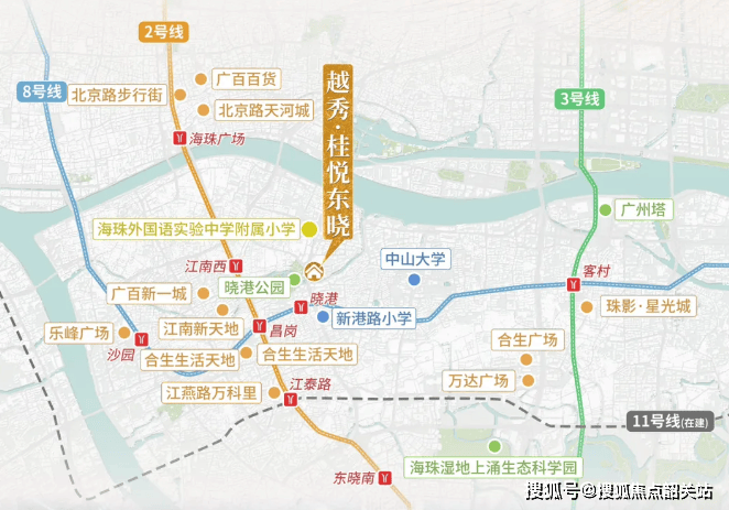 越秀桂悦东晓位于广州市海珠区东晓路板块,紧邻滨江东与海珠西交界处,距离中山大学不远,周边老城生活氛围浓厚且配套设施成熟。项目距离地铁8号线晓港站约600米,交通便捷;西侧为晓港公园,不仅提供了优美的自然景观,也为居民日常休闲提供了理想场所。教育方面,越秀桂悦东晓已被纳入海珠实验小学教育集团,距离项目仅约500米,并享有小升初摇号的优势,包括五中、海珠外国语实验中学、南武中学等在内的优质教育资源近在咫尺。
