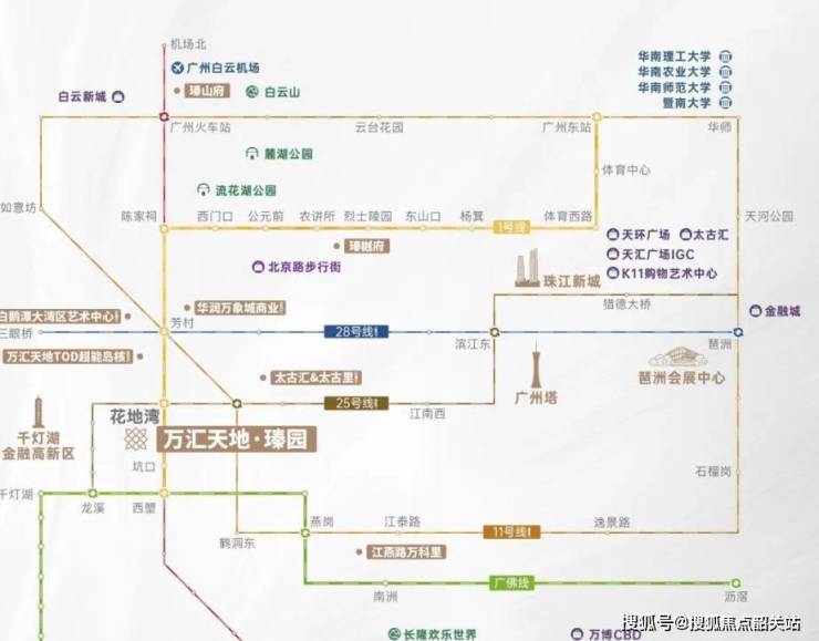 项目附近有花地湾TOD枢纽,属于地铁1号线、25号线花地湾站的交汇换乘点,距离地铁花地湾站约800米左右,步行需12分钟,1个站到达芳村TOD可换乘11、22号线地铁,11号线还是打通广州地铁线网的“换乘之王”,全线32个站点中,有26个为换乘站,16个与既有线路换乘,届时从项目出发去往广州各区都很方便