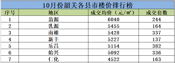10月份,韶关各县城中,翁源楼价连续两个月超越南雄,位居县城楼价之首!具体楼价情况如下。(注:由于韶关住建网服务器会有数据延时,数据存在延时误差)