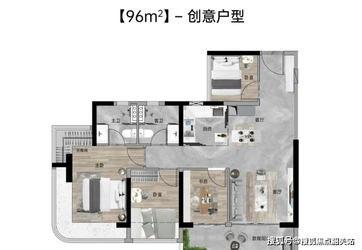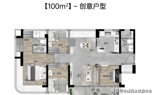 项目所有楼栋采用扭转45°角排布,实现前后无遮挡、四边位采光,户户三至四开间朝南。主力户型使用率普遍超100%,其中80㎡三房达107%,93㎡四房高达109%。80㎡户型拥有12.6米超大面宽,93–100㎡产品配备5.7–6.1米巨幕阳台,主卧均配置270°弧形玻璃幕窗,视野开阔通透。得益于整体抬高约10米设计,即便低楼层也能享受良好采光与观山视野。