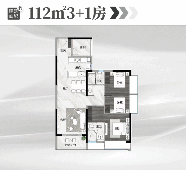112平方米三房两厅两卫:户户单边,南向低密度设计,全屋80厘米阔景飘窗升级。