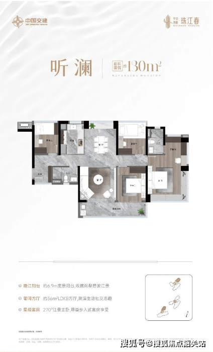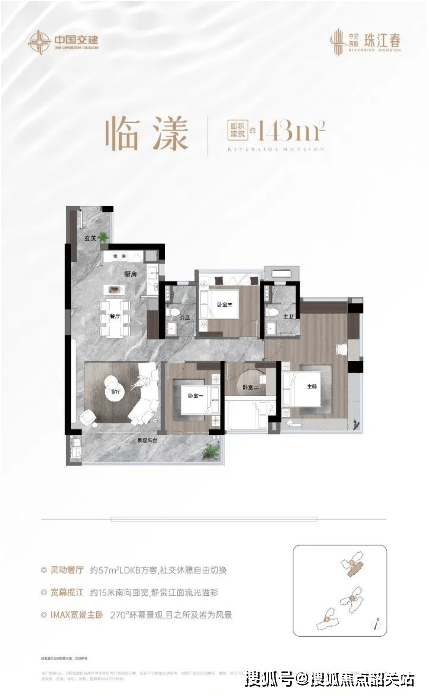 拥有 270° IMAX 奢华瞰江视野,6.9 米宽景阳台与 57㎡超大 LDKB 客餐厅,强调社交属性和空间感。