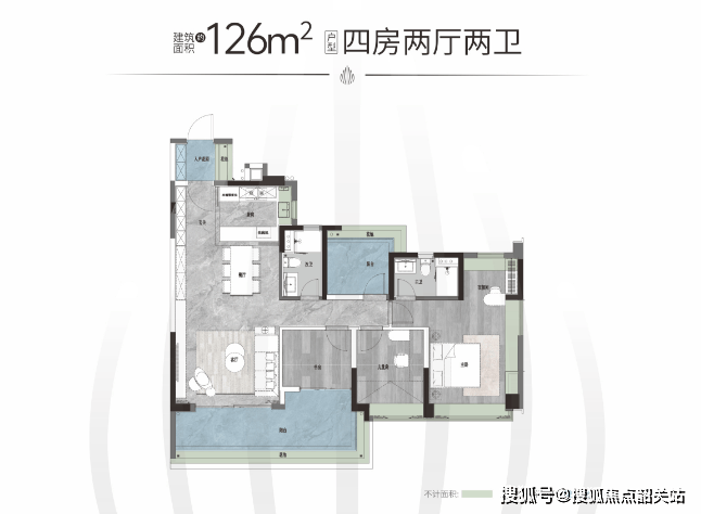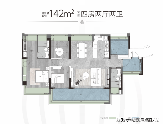 125-142㎡南向江景四房:这类户型设计有5.7米宽的客厅,南北对流,酒店式主卧三面采光,全南向阳台,高层阳台长度达8-9米。
