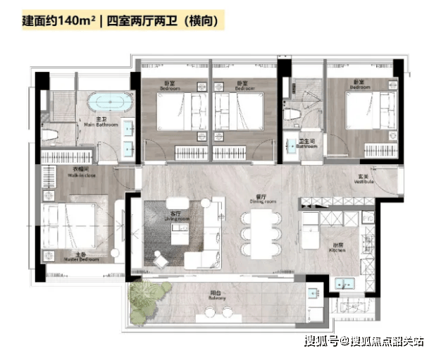 其次是建面约140平方米的四室两厅两卫户型,分为横向与纵向两种布局。横向布局的140平米户型被誉为“纯正大四房”,坚决拒绝"3+1”的伪四房概念,确保了每个房间的独立性与舒适性。三面采光的設計,让阳光能够全天候洒满室内,营造出温暖明亮的居住氛围。约7.7米的超长跑道式阳台,不仅是晾晒衣物的场所,更是一个小型的空中花园,业主可以在这里打高尔夫、品茶赏景,尽情享受户外生活的乐趣。主卧套房面积约34.7平方米,配备了独立卫浴、衣帽间及观景飘窗,堪比五星级酒店的行政套房,为二人世界营造了极致的浪漫与私密空间。