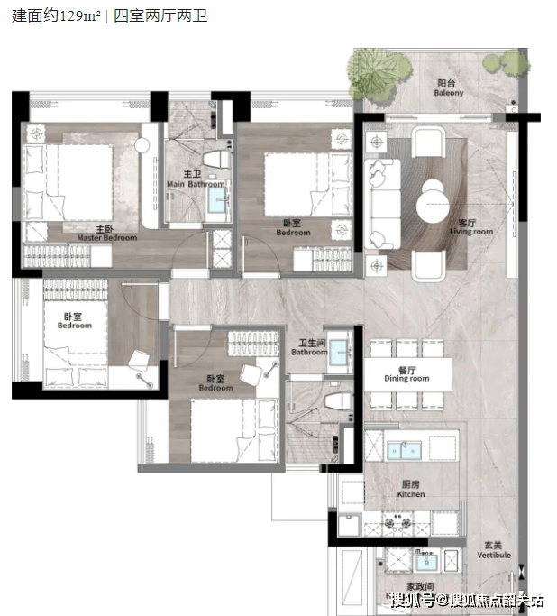 首先是建面约129平方米的四室两厅两卫户型。这一户型被定义为“全周期大宅”,旨在满足家庭全生命周期的居住需求。设计上采用了LDK一体化布局,将客厅、餐厅与厨房融为一体,不仅扩大了视觉空间感,更增强了家庭成员之间的互动与交流。南向大开间的设计,使得整个房间采光极佳,园林景观尽收眼底。餐客一体的设计让家庭生活更加宽敞舒适,特别适合有小孩的家庭,为孩子提供了充足的玩耍与学习空间。此外,该户型还特别注重收纳系统的规划,隐藏式收纳设计让空间利用更加高效,满足了现代家庭日益增长的储物需求。
