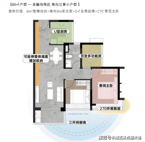 在产品户型设计上,海语天悦湾精准洞察了不同家庭结构的居住需求,推出了80㎡至141㎡的多元化户型,且全部采用全南向蝶形布局,采光通风极佳。80㎡户型是金融岛上罕见的南向江景小户型,拥有6m³整墙收纳系统、南向9米采光面及270°景观主卧,极致利用每一寸空间。96㎡户型被誉为“收纳狂魔”,配备7.6m³整墙收纳、5㎡全景厨房及270°景观主卧套间,是年轻家庭的理想之选。123㎡户型则打造了金融岛唯一的阳光玄关,拥有约26㎡南北对流主卧套房,4.5开间朝南,并可灵活改造为双套间,完美适配三代同堂家庭。压轴的141㎡户型更是“超级方厅”的代表,约46㎡的客餐厨一体化空间,搭配约14.5米的南向超大采光面,视野开阔,气势磅礴,尽显豪宅风范。所有户型均方正实用,得房率高,部分高层单位更可直面壮阔珠江江景。无论是刚需上车还是终极改善,海语天悦湾的户型都能完美匹配,诠释了“小面积大功能,大面积大享受”的居住哲学。