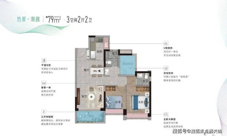 建面约79㎡2+1房,三开间朝南让室内的空间通透舒适,主卧套房设计给予主人不将就的独立,多飘窗增加收纳空间。