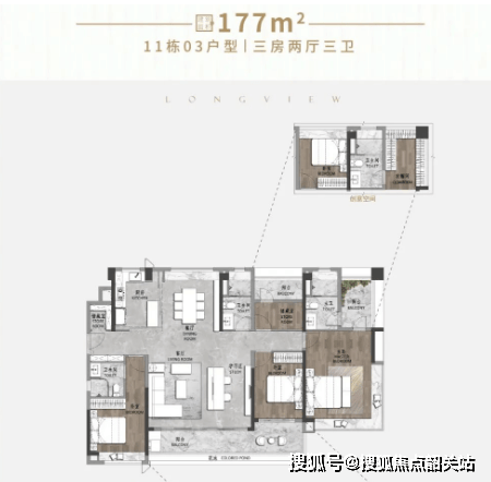 178-182平方米四房三卫:三开间朝南,餐客厅面积达到50平方米,配备16米长的270度转角大阳台,总价960万元起。