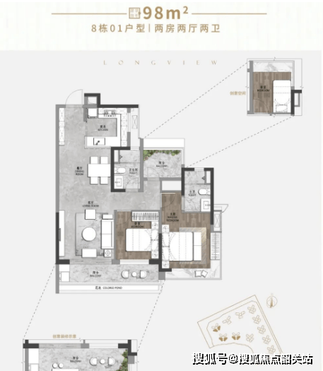 双阳台配置:生活阳台+景观阳台分离,兼顾实用与观景;