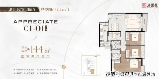 144㎡四房两厅二卫,东南向户型,阳光入户,瞰景主套房,270度望江,餐客厅一体,阔尺享受,奢享级四房,三代同堂