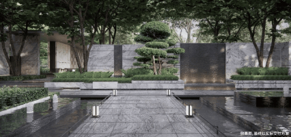 步入园区内部,迎宾水院作为第一重归家景观,对称式布局规整雅致,两侧全冠移植乌桕古树,枝条角度经过人工精细调整,造型错落有致,三层叠水景观层层递进,中央点缀铁冬青景观树,寓意雅致吉祥,流水景观弱化外界噪音,营造静谧的归家氛围。中心花园借鉴东京安缦酒店度假美学,户外休闲廊架采用奢石墙面与地面铺装,精工拼接工艺考究,打造酒店式户外休憩空间,闲暇时刻可静坐观景,感受园林绿意与滨水微风。