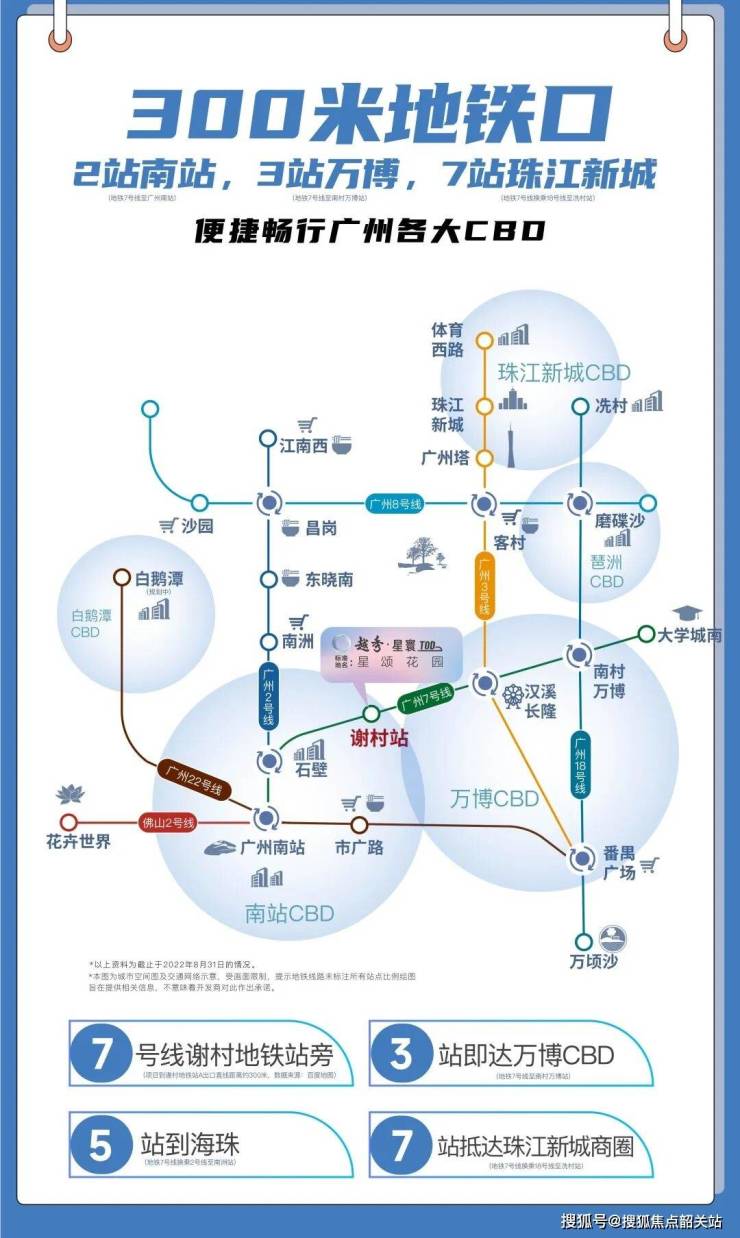 越秀星寰 TOD 紧邻地铁 7 号线谢村站,步行约 300 米可达,2 站直达广州南站,3 站抵达万博 CBD,7 站畅达珠江新城,快速串联广州核心商圈。7 号线可换乘 2、22、3、18、4 号线,构建全城轨道交通网络,通勤出行高效便捷。