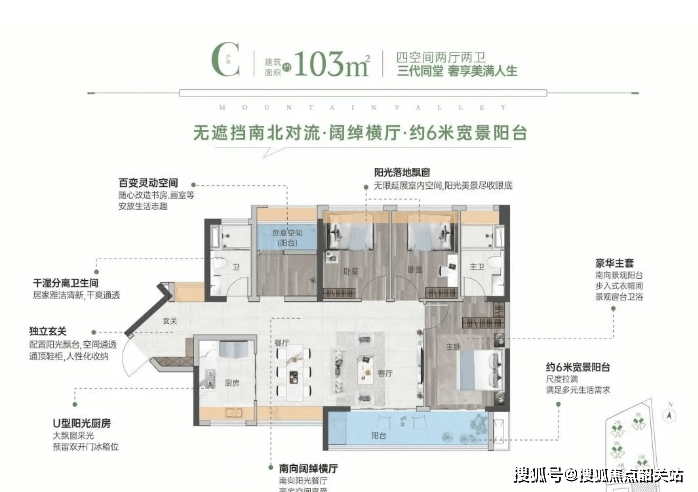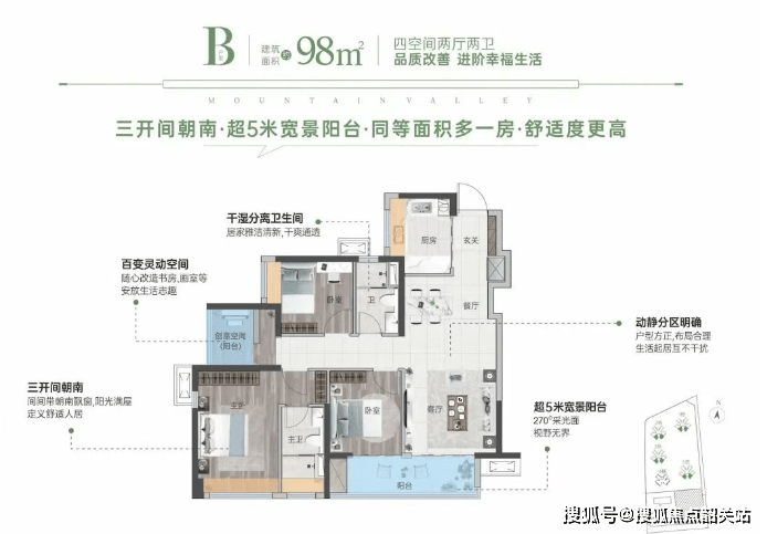 在售户型包括85㎡三房两厅两卫、98㎡四房两厅两卫以及103㎡四房两厅两卫(横厅)。这些户型均采用了全南向设计,保证了充足的采光和通风效果。特别是,98㎡户型为区域内唯一的97㎡四房户型,非常适合精英阶层的家庭居住需求。此外,户型使用率高达94%,大大提高了居住舒适度。