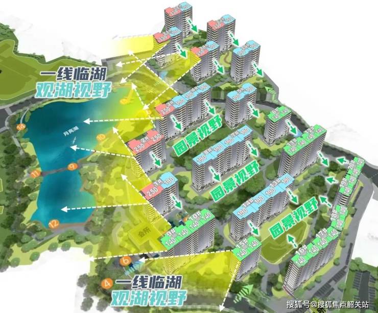 答:全部为低密板楼设计,2 梯 2 户相当于 1 梯 1 户,超高使用率,LDKG 一体化设计,双主套、双阳台,窗地比高达 38%,主卧 270° 大飘窗,部分户型一线观湖。