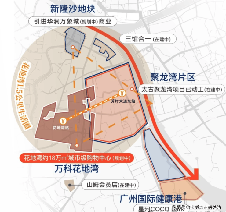 花地湾片区主要由万科统一开发,与白鹅潭核心区、聚龙组团共同构建起珠江西岸 CAZ(中央活力区)的黄金三极,致力于打造 “产、商、住” 一体的新城市中心,是国家战略支点,辐射三大都市圈,花地湾更是占位白鹅潭世界商圈。