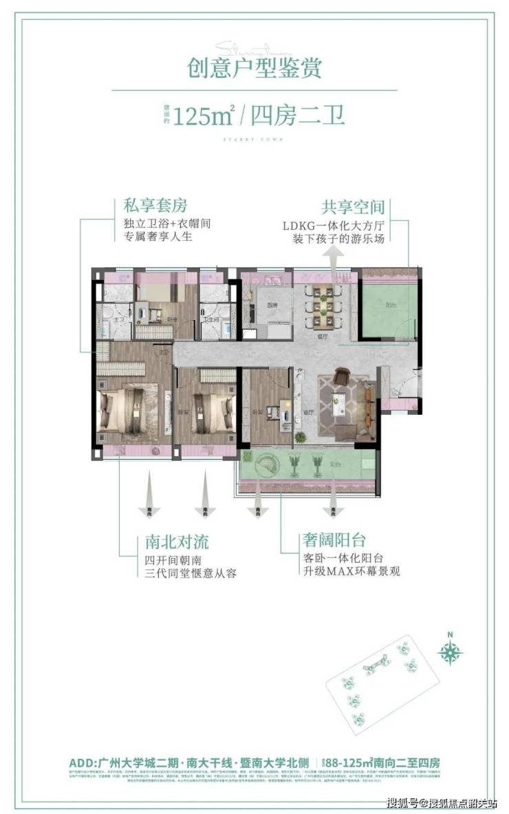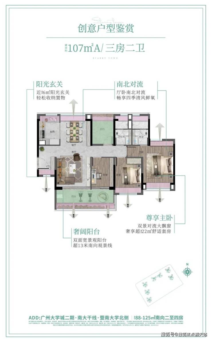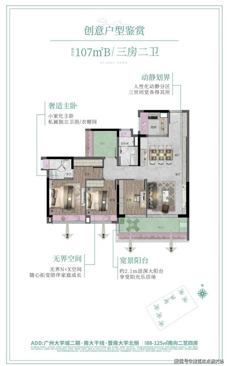 越秀·大学·星汇城二期住宅户型涵盖88-125㎡三至五房,户户朝南,270°宽景大阳台设计,实现采光、通风与景观最大化。小户型88㎡三房设计为四面宽,三卧朝南,11米超长景观线,空间灵活可扩展;107㎡四房户型配南向观景玄关,客厅与主卧双向对流,双阳台设计;125㎡五房户型4.5开间朝南,餐客一体化,南北对流与大阳台布局结合,高使用率实现功能与舒适兼顾。户型设计注重动静分区,满足二胎及多代同堂家庭的生活需求,同时兼顾收纳功能与多功能空间,整体提升居住体验。