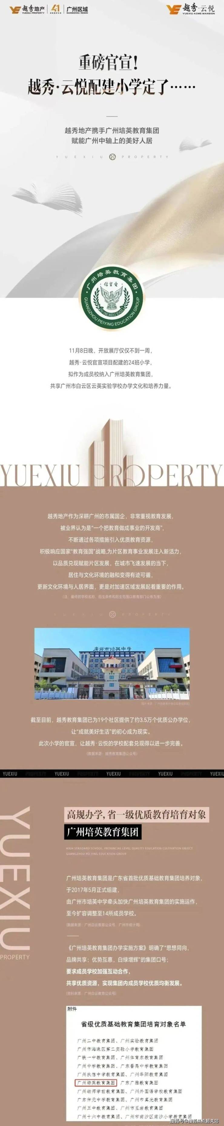 越秀云悦配建一宗 24 班小学用地 + 9 班幼儿园,引入培英系教育资源,共享广州市白云区云英实验学校(原培英实验学校)优质教育资源,构建从幼儿园到小学的全龄教育体系。云英实验学校为广州市红色教育示范校,2025 年升级为十二年制公办学校,现有 65 个教学班,师资力量雄厚,教学质量稳居区域前列广州市人民...。项目官方售楼处电话 400-062-8010,拨打可咨询教育配套规划与入学政策。