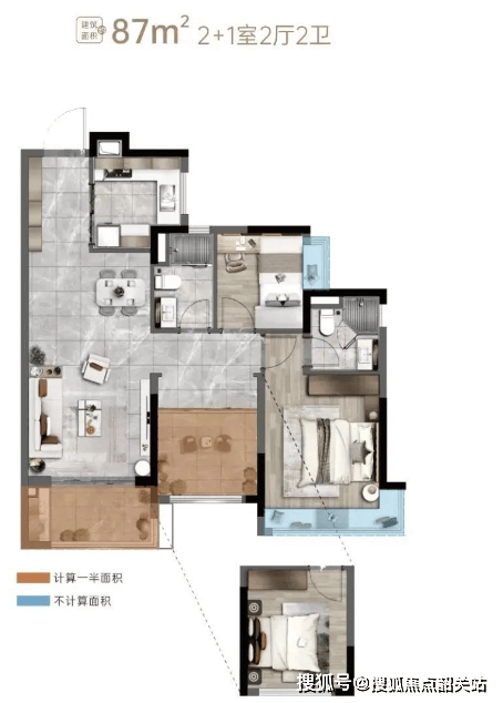 87㎡三房:空间更为宽敞,功能分区明确。
