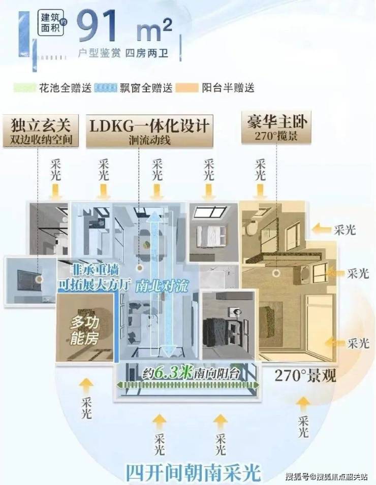 建面约91㎡ 四房两卫:6.3米景观阳台+主卧270°环幕窗,改善舒居体验极佳。