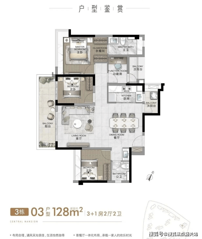 (四)建面128㎡四房两卫:南北双阳台对流,私密性更强