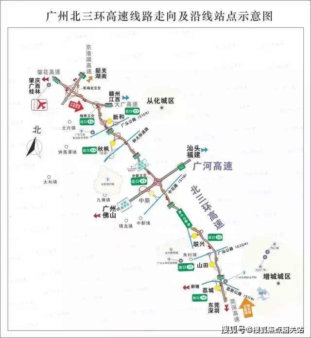 该线路起点位于增城区荔城镇与石滩镇交界处的上塱村,在增城区共有6个出口,分别是石滩(石头)、增城(挂绿湖)、荔城(荔新公路肉联厂)、朱村东(石山田)、教育城(联兴)、中新(福和)。