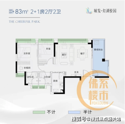 建面约83㎡:2+1房两卫户型,东面设有一景观阳台,可灵活改造成一间房。
