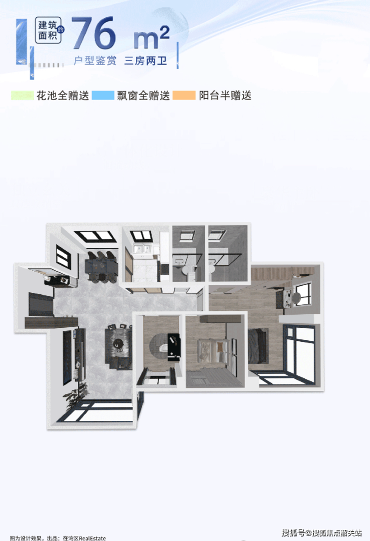 76㎡和 78㎡的三房两卫户型,空间布局合理,花池全赠送,飘窗全赠送,阳台半赠送,有效增加了室内使用面积。
