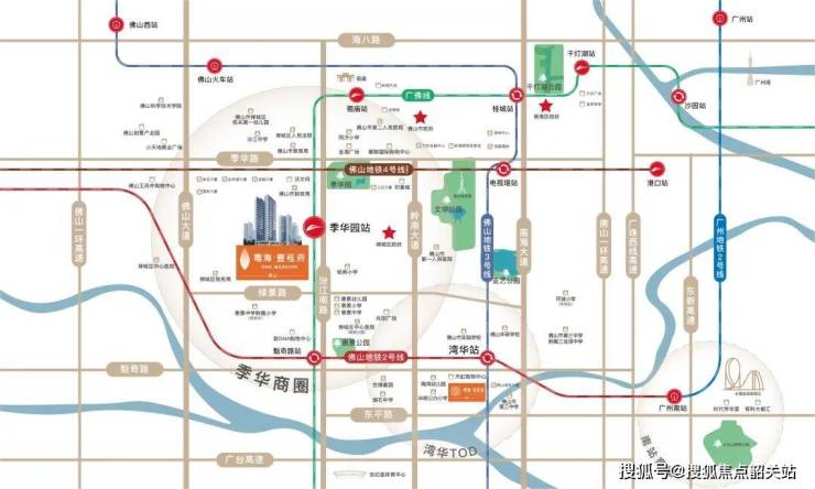 邻佛山大道、季华五路、汾江路等城市主干道,执掌3地铁交通,距广佛线季华园站仅约200米,坐享2号线、4号线(在建中);2站到祖庙,8站到千灯湖,10站到广州南。