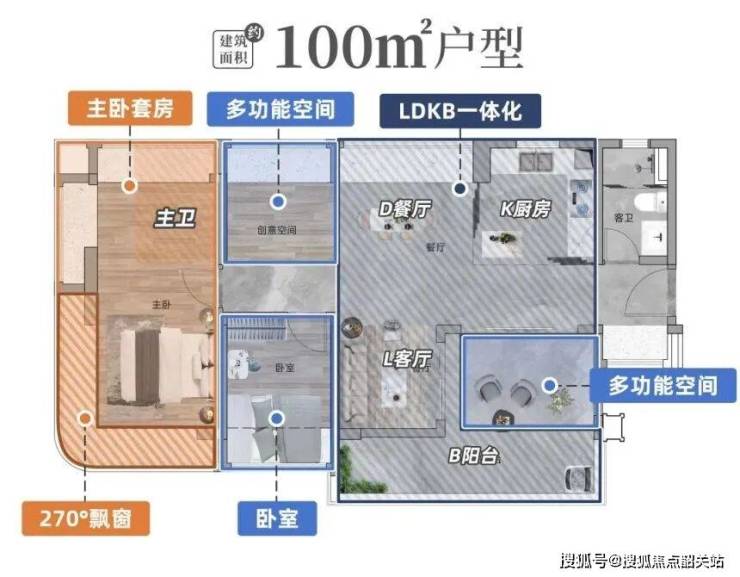 80㎡三房两厅两卫:东南朝向,四开间朝南,主卧 270°弧形飘窗,适合小家庭。