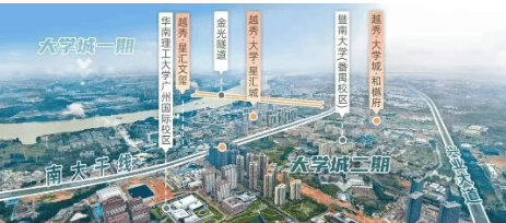 自驾方面优势明显,通过南大干线可快速通往东西方向,南北向走金光东隧道,10 分钟左右就能轻松抵达大学城。去往万博全长 7.6 公里,耗时约 12 分钟;前往琶洲全长 16 公里,耗时约 21 分钟;驶向金融城 17 公里,耗时约 20 分钟。在不堵车的情况下,20 分钟左右即可畅达各区中心,极大地缩短了通勤时间与城市距离。