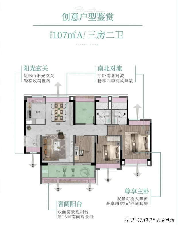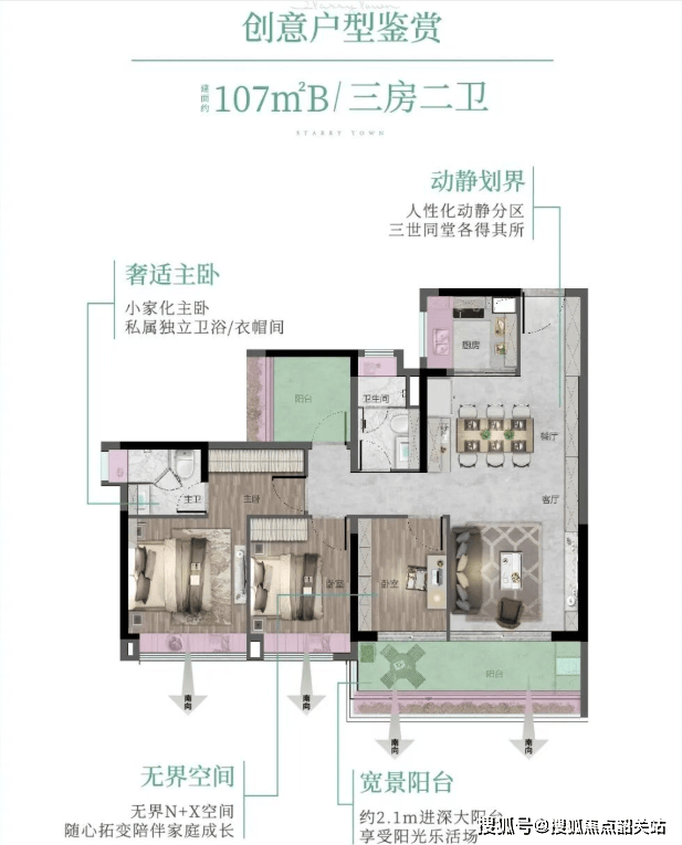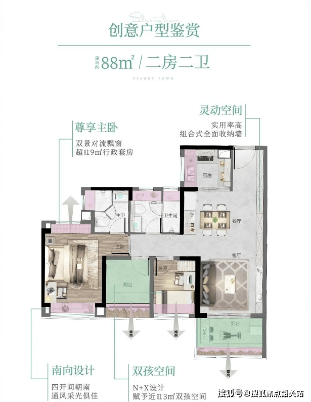 88㎡ 3空间2厅2卫:罕见四面宽小户型,三卧室朝南,超11米景观线,精细收纳设计。