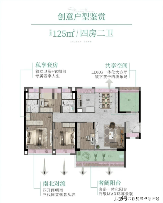 125㎡ 5空间2厅2卫:客餐厅南北对流,舒适阳光宅,餐客一体化设计,超高实用率,亲江新品。