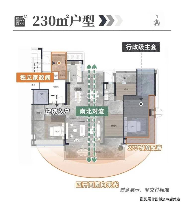 :南北双阳台,独立电梯厅,LDKB一体化大方厅,打造高端改善家庭全生命周期的居住方案。