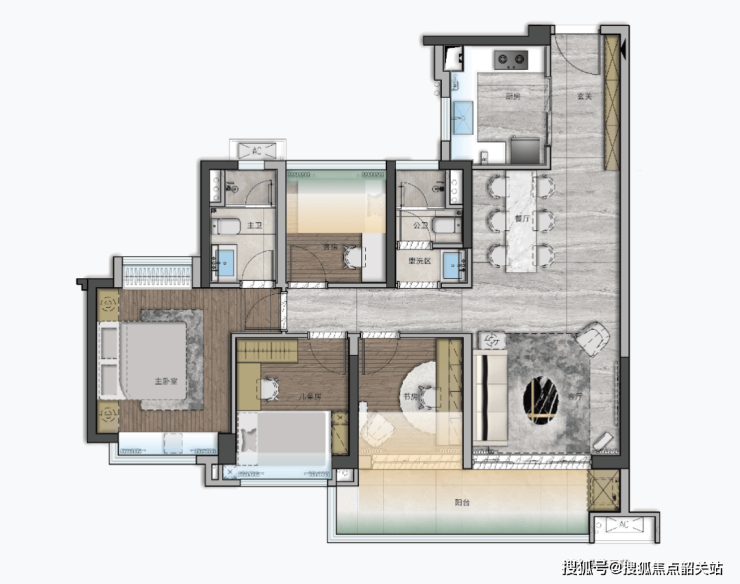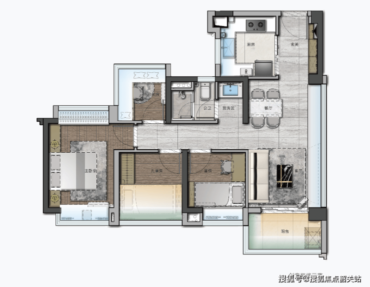建面约125㎡四房两厅两卫:双阳台设计,南向景观面达12米