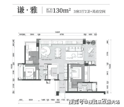 130平方米户型:东向带入户花园,适合鞋柜收纳;主卧与次卧分别位于东西两个方向,其中一个次卧飘窗西向,可能会有西晒的问题。