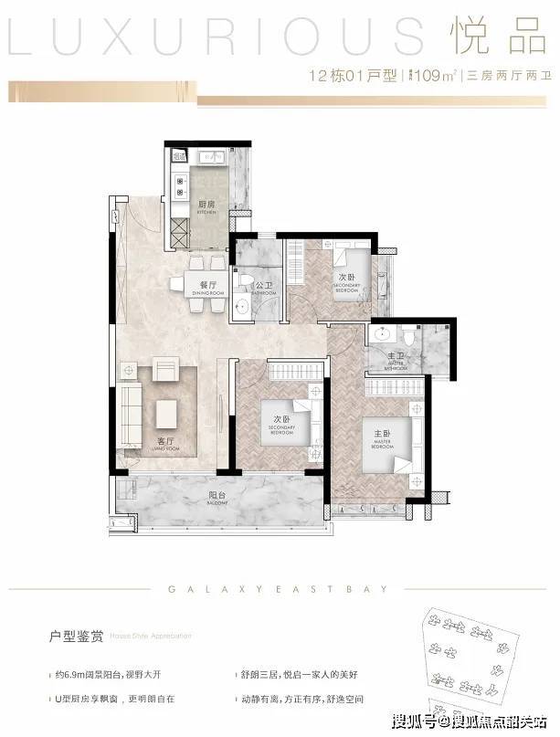 112㎡三房两厅两卫:南北通透,主卧套房设计,客厅连通6.5米景观阳台,直面蕉门河江景;
