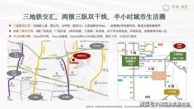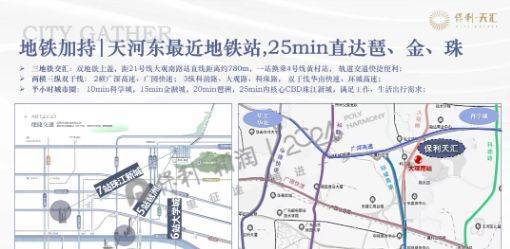 《保利天汇》位于天河智慧城核心区,周边交通网络多层级覆盖。项目距离21号线大观南路地铁站约1.2公里,步行约15分钟,可通过短途接驳车或电动车实现高效通勤。21号线可与4号线及5号线换乘,便捷到达金融城、珠江新城及员村等核心商务区。