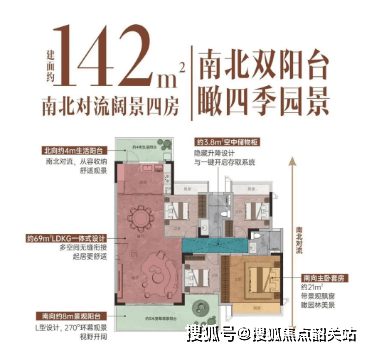 以142㎡南向四室两厅二卫为例,户型方正,南北通透,采光通风良好。户户配备双阳台,尤其是约8米宽的观景阳台,为家庭成员提供了绝佳的视野享受。