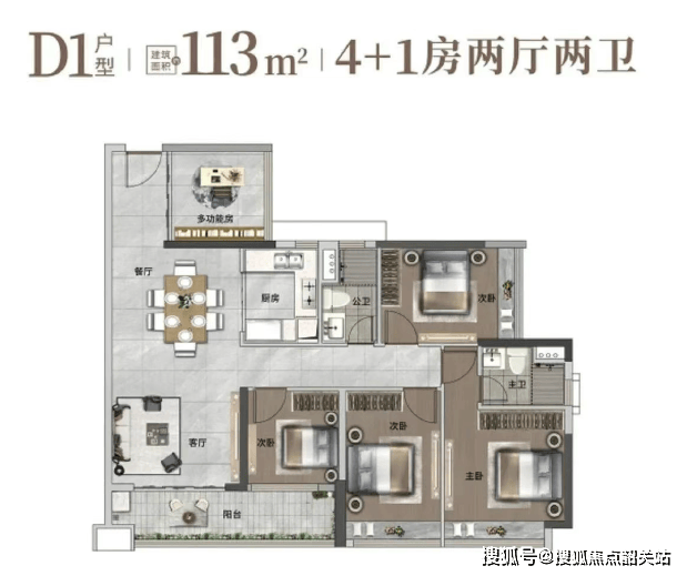 113㎡ 五房二卫:南向四开间,奢适主套,约6.3米大阳台,功能多样。