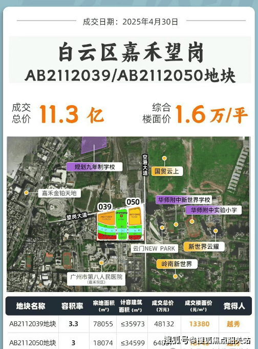 值得关注的是,该地块的土拍过程极具竞争力,保利、龙湖、越秀、国贸四家企业参与报名,涵盖央企、国企与民企。最终,越秀地产经过13轮竞价,以4.81亿拿下嘉禾望岗AB2112039地块与050地块(打包拿下),溢价率16%,起始价4.16亿。其中,两地块地价分别为1.34万/㎡和1.87万/㎡(未扣除配建),尽管需配建54班九年一贯制学校、幼儿园及停车场,但1.34万/㎡的地价仍预留了充足的操作空间,也彰显了开发商对板块后市的坚定信心。