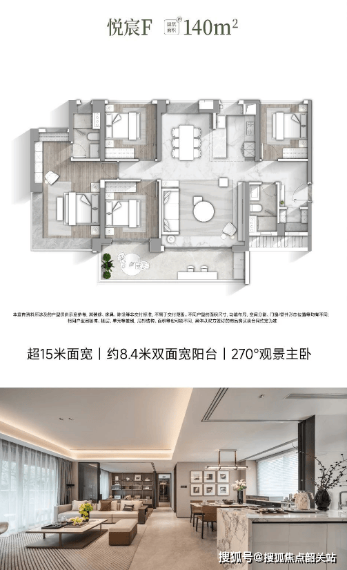 悦宸F户型(约140㎡):南北对流主卧,270°采光,厅卧空间灵活改造,约8.4米双面宽阔景阳台,匹配全生命周期使用。