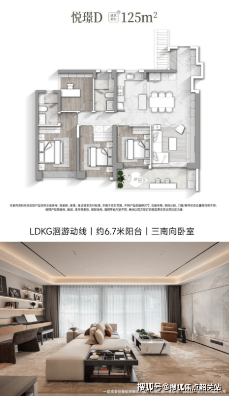 悦璟D户型(约125㎡):LDKG洄游动线,三南向卧室,适配全生命周期,半开放式中西厨房,多样生活随心而动。
