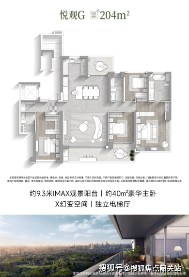 悦观G户型(约204㎡):LDKG一体化设计,约9.3米南向IMAX观景阳台,约40平方米豪华主卧套房,静谧休憩,惬意起居。