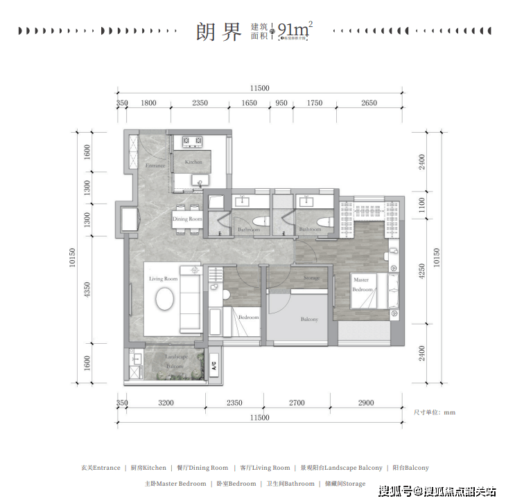 91㎡ 2房2厅2卫+1灵动空间:南向四开间设计,拥有超过11米的采光面,宽敞的LDK一体化设计提升了卧室的功能性。