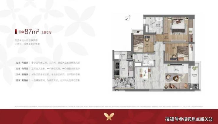 87平方米:三房两卫设计,增加了卫生间的便利性。