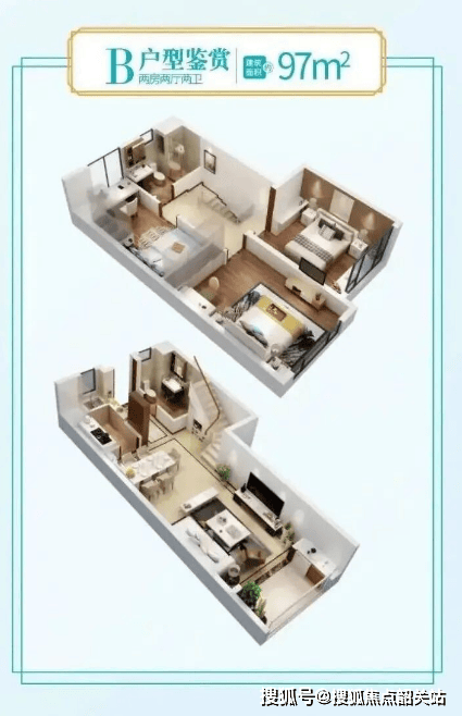 主力户型是97㎡三房(可变0+3或1+2格局)和111㎡四房,全部为纯南向复式。以97㎡为例,下层做客厅+厨房+公卫,上层安排三个卧室,动静分区清晰;加上赠送面积后,实际使用接近130㎡,得房率相当可观。样板间里看到的楼梯下方还巧妙做了储物柜,小户型也能兼顾收纳与动线流畅。