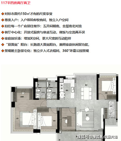 设计亮点:实现3个“0”,即0牺牲四房空间、0浪费连片体系化收纳、0遮挡主卧公园舱观景